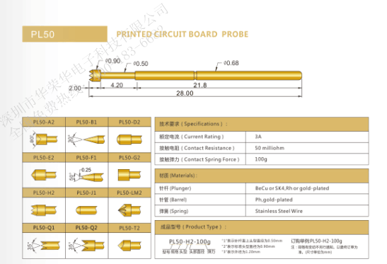 隨著工業(yè)發(fā)展和電子PCB的不斷升級,電子PCB測試探針也在研發(fā)各種規(guī)格的產(chǎn)品來滿足測試需求。從最早的單層板到目前發(fā)展的多層板喝軟板,由于不同大小的PCB板需要不同規(guī)格的PCB測試探針去滿足其測試,探針規(guī)格也不斷演化。如:P160、P75、PL75、PM75、PL50、G1353等。針頭添加了八爪皇冠頭、自我清洗三爪皇冠頭、Hb3帶膠管九爪針等等。探針的制作材料也越來多樣。多樣化的探針尺寸、頭型、彈力來滿足測試需求。
