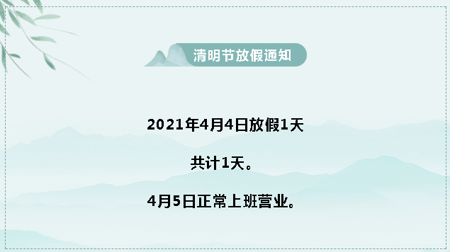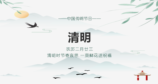 又是一年清明際,又是追思紀(jì)念時。清明節(jié)是中國的傳統(tǒng)節(jié)日之一,它不僅是人們祭奠祖先、緬懷先烈的節(jié)日,也是中華民族認(rèn)祖歸宗的紐帶。華榮華全體員工祝大家萬事順意,平安健康!關(guān)于2021年“清明節(jié)”放假時間,我司作出以下安排: