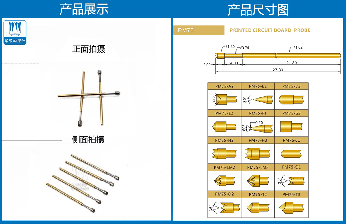 產(chǎn)品簡介:PM75探針、1.02mm測試針、菱形頭探針、總長27.8mm、彈簧針、測試針、頂針、探針